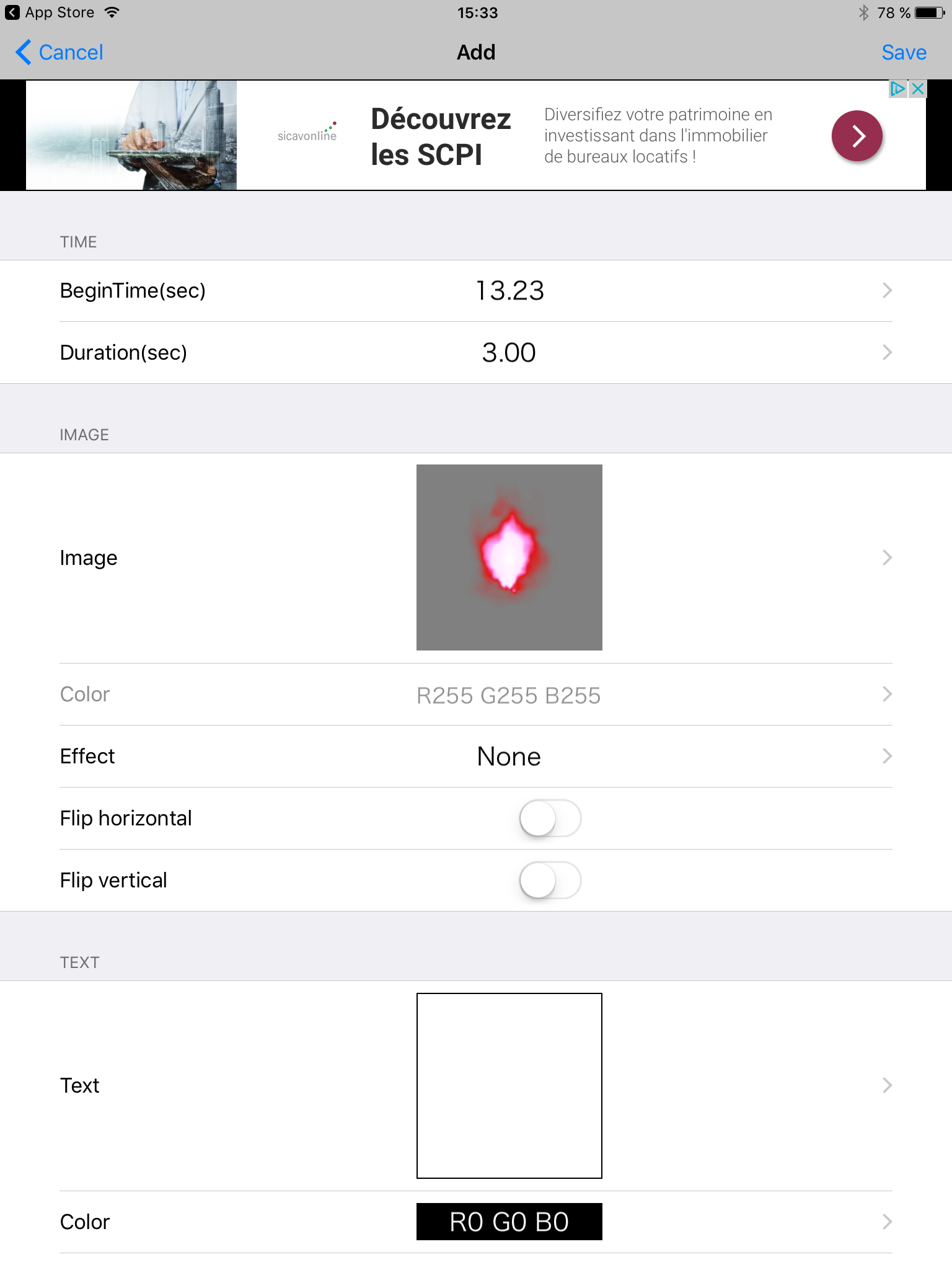Mais l’avantage est que l’on n’est pas obligé de se limiter au catalogue et qu’il est possible d’ajouter tout ce que l’on souhaite comme image, en particulier des images avec fond transparent. Une fois votre éléments sélectionné, il faut régler son temps d’affichage qui par défaut est de trois secondes. Il y a là un point à améliorer puisque que le temps de début et de fin doivent être saisis en chiffres et il n’est pas possible de le modifier graphiquement. Une fois l’élément inséré, vous pouvez le déplacer et le redimensionner classiquement par glisser déposer et pincement des doigts.