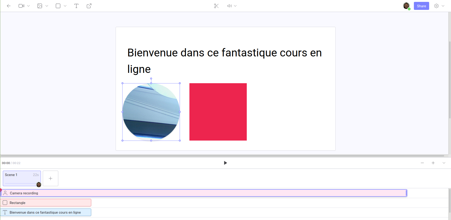 L’ajout d’élément se fait simplement par le menu supérieur. Il est possible d’ajouter des vidéos et de l’audio et, c’est un atout majeur, de filmer directement son écran ou d’enregistrer sa webcam, ou les deux en simultané. Bien entendu, il est possible d’importer tout autre fichier vidéo classique.