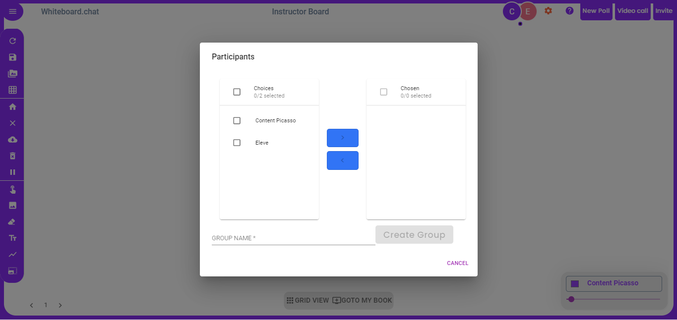 Et cela est possible jusqu’à 100 participants. Mais ne nous arrêtons pas là puisque Whiteboard Chat propose encore mieux. A l’accueil, vous pouvez choisir entre collaborer ou enseigner. Collaborer pour permet d’accéder à un tableau blanc classique. Enseigner vous permet d’enseigner à un ensemble de tableaux blancs. Pour être plus précis, un tableau pour l’enseignant, un tableau individuel pour chaque élève et la possibilité pour l’enseignant de créer des tableaux de groupe ou d’afficher les tableaux des élèves.