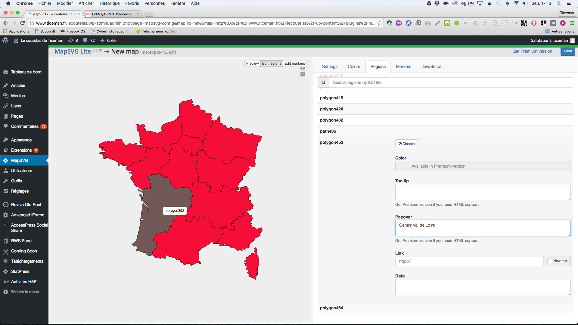 WordPress par le biais de multiples extensions est en train de devenir un véritable outil d’édition et de construction. On l’a vu avec H5P, cette extension qui permet de rendre votre wordpress vraiment interactif. Mapsvg confirme cette tendance. A savoir, ici, on ne teste que le version gratuite qui permet déjà quelques éléments. la version payante à 35 euros permet beaucoup plus notamment l’utilisation de javascript qui ajoute une grosse dose d’interactivité.