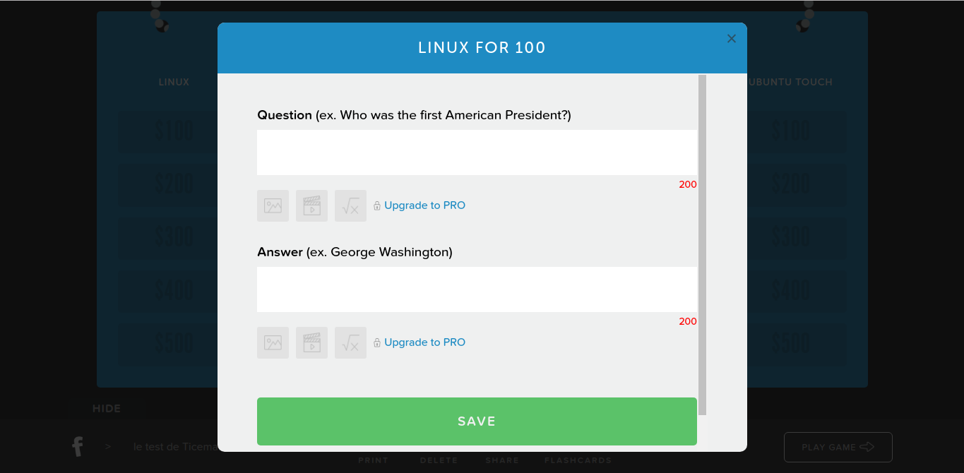 Une fois l’adresse choisie, on se retrouve directement sur le plateau de jeu. Il suffit de modifier le titre du plateau, celui des catégories puis de cliquer sur chaque case pour définir le binôme question réponse.