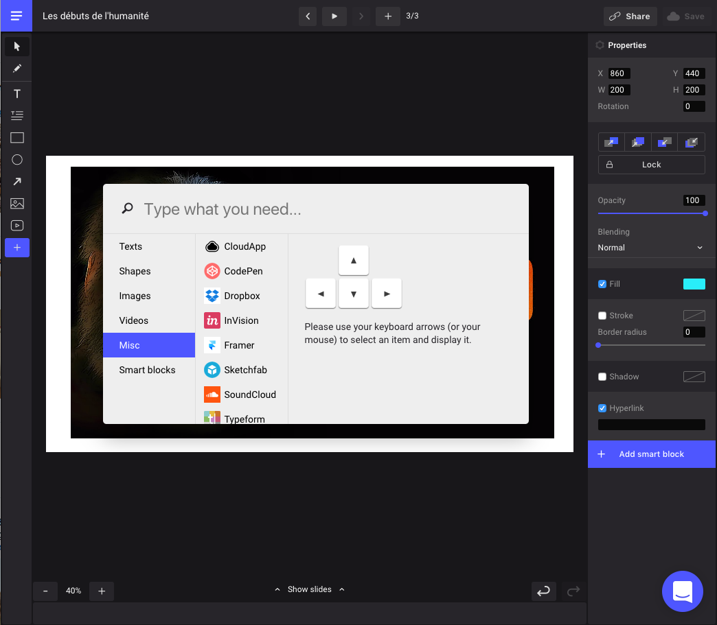 Il est aussi possible d’insérer de nombreux éléments en utilisant le bouton + du menu de gauche. C’est un des atouts majeurs de la solution qui permet outre les classiques vidéos de différents services ou encore lecteurs audio d’autres, d’ajouter des modèles en 3D ou encore n’importe quel site puisqu’il est possible d’insérer des iframes provenant de n’importe où. Virtuellement, vous pouvez insérer dans votre présentation, tout élément présent sur le net.