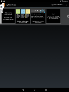 Pour créer une nouvelle capsule, il suffit de toucher “New Narrative” et le menu de création s’ouvre. Pour en modifier une existante, il suffit de la toucher pour atteindre le menu d’édition. Le menu de base est très simple et accessible y compris aux plus jeunes élèves.