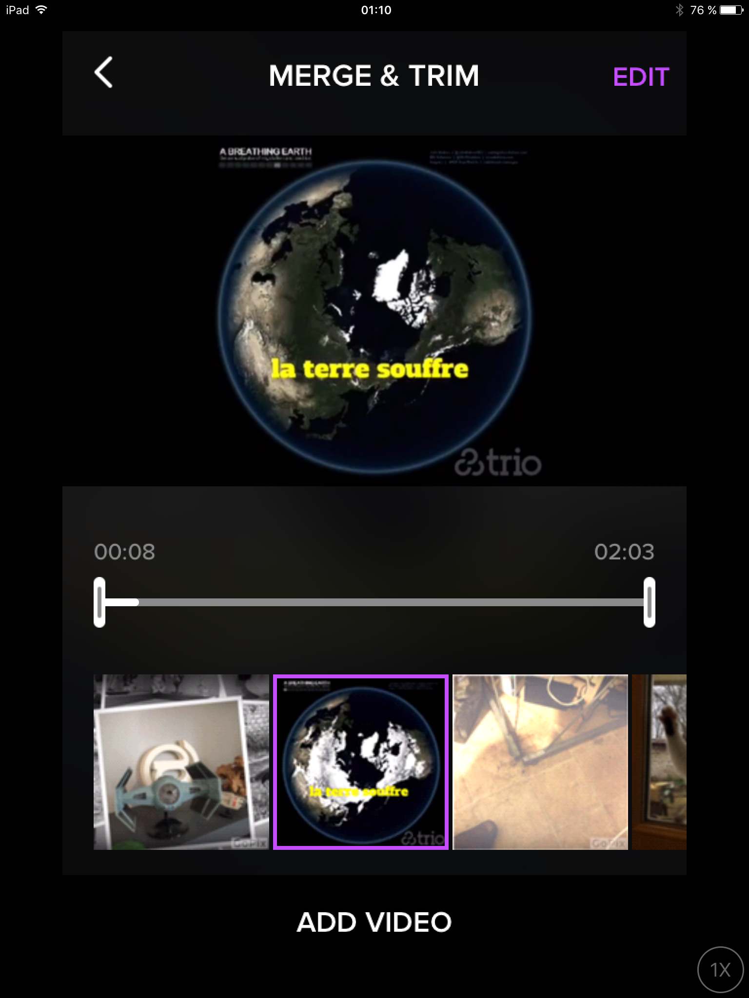 Une fois importées, vous disposez alors d’une vue centrale avec l’intégralité de la vidéo et en dessous l’ensemble des vidéos importées. Vous pouvez par simple glisser déposer les réordonner et en touchant chaque vidéo les découper en ajustant les poignées au début et à la fin de chaque extrait.