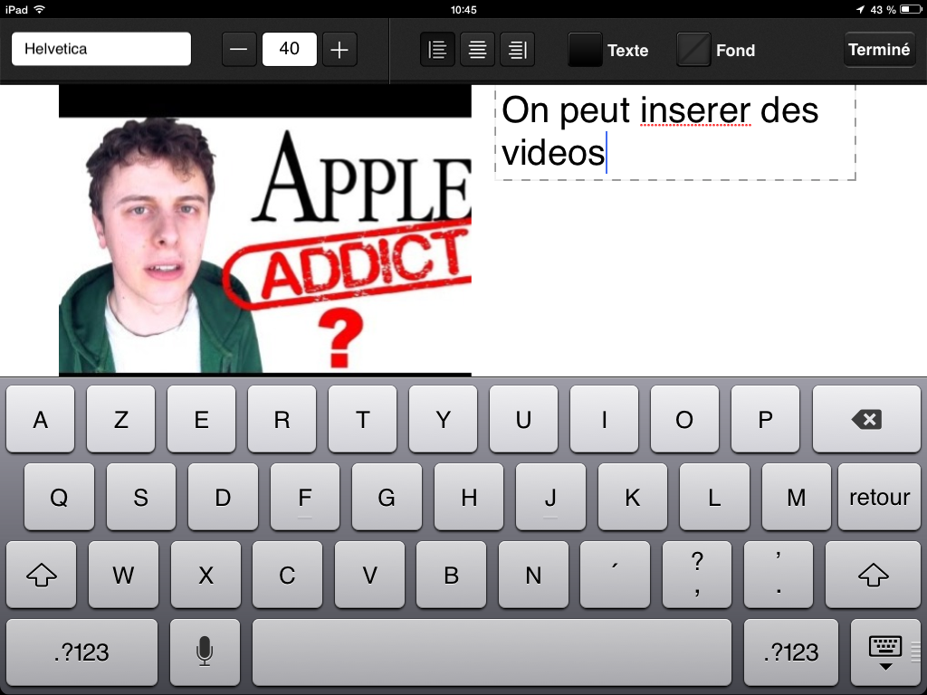 Le principe est simple. on tape avec deux doigts, cela ouvre un encart dans lequel viendra s’insérer un médias. Cela est particulièrement agréable car il est même possible de concevoir sa présentation à vide et ensuite d’ajouter les médias. L’insertion de texte est aussi clairement pensé tablette et le texte est éditable comme avec n’importe quel logiciel de présentation sur ordinateur.