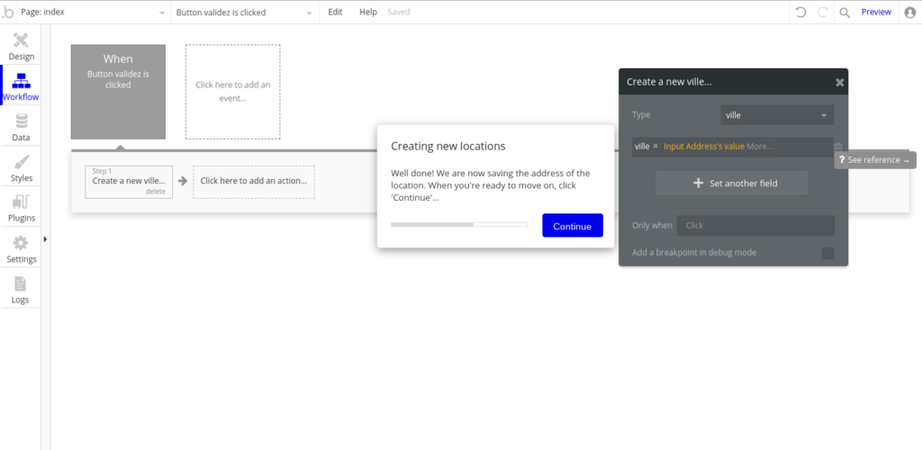 Ensuite, vous pouvez programmer chaque élément et établir des relations entre eux. Je conseille vivement de réaliser les tutoriels pour ce points car, selon les besoins, on peut se retrouver avec quantité d’interactions. La programmations est visuelle c’est à dire que chaque élément est représenté par un bloc et que les actions apparaissent en sous blocs. Vous pourrez établir des actions simples comme des liens vers d’autres éléments, le déclenchement d’un élément, mais aussi des actions plus complexes comme l’enregistrement de données ou la sélection d’éléments dans un catalogue de données.